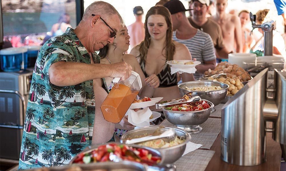 Time for something to eat, so be pampered as our crew prepare your meal. Throughout you experience and time with us on board, there is a choice of Sangria, beer, soft drinks, juice, coffee or water available. We care and want to avoid the use of one time plastic – all our customers receive a souvenir reusable drinking glass.